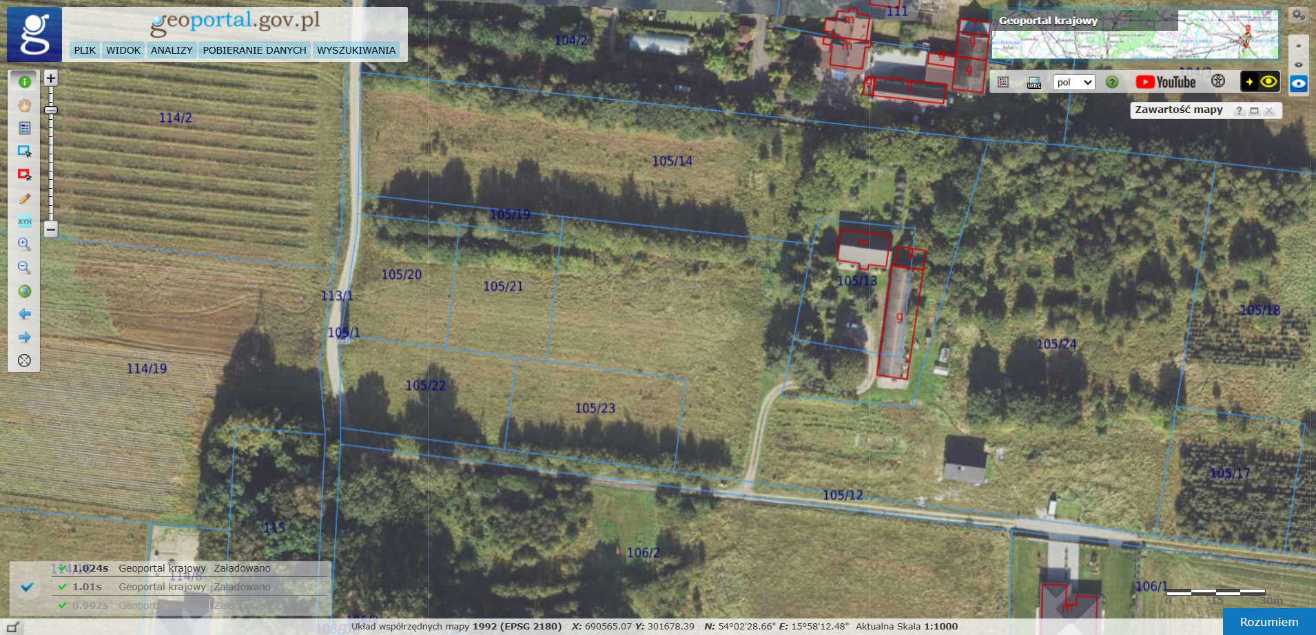 Dla każdej z działek dostępna jest mapka z dokładnymi wymiarami boków i powierzchnią.